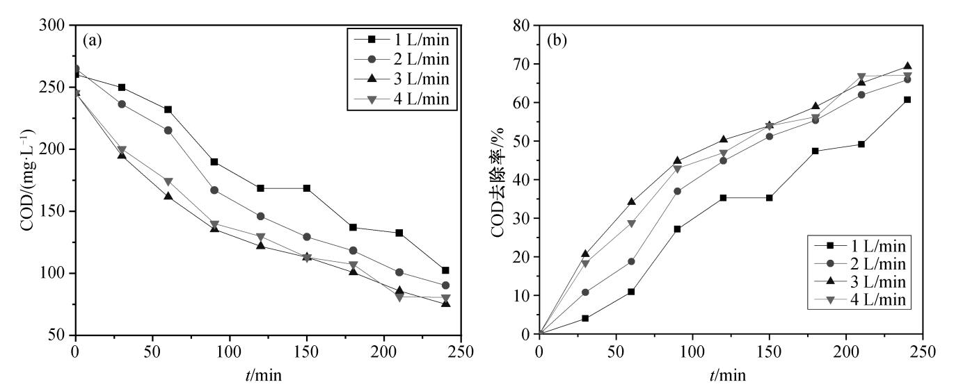 在催化劑投加量為 30%, 初始 pH 為 7 的條件下, 設置臭氧氣體流量分別為 1, 2, 3和 4 L/min, 探討臭氧氣體流量對催化臭氧化降解效果的影響, 實驗結(jié)果如圖 所示。