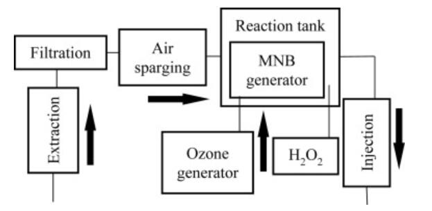 開發了現場修復設備(圖3 )用于現場測試。修復系統包含三個部分:提取單元,反應單元和注射單元。從該地點提取受污染的地下水,并進行過濾以除去土壤顆粒。過濾后,用空氣噴射裝置處理地下水以除去三氯乙烯。隨后,將處理過的地下水注入到反應罐中。MNB發生器位于水箱內部,用于原位產生臭氧MNB。在產生臭氧MNB的過程中,以1∶1的臭氧∶H 2 O 2的質量比添加H 2 O 2試劑。臭氧MNB和H 2 O之后添加2份水,通過注入單元將水注入地面。從反應罐到進樣單元的流量為15  L / min,停留時間為33.3  min,以實現 很佳的MNB生成。從當地時間每天09:00到18:00進行了六天的原位地下水修復。對地下水進行采樣以監測三氯乙烯的濃度。