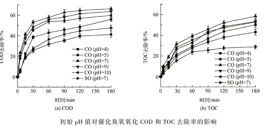 廢水初始pH 值是影響催化臭氧氧化效果的主要因素之一。廢水初始pH 值會極大影響臭氧的分解速度、羥基氧化鐵表面羥基的電荷形態及有機物在水溶液中的存在形態,從而影響催化臭氧氧化的效果。實驗選取了5 個不同的pH 值,用1 mol·L - 1 的硝酸和NaOH 溶液調節廢水pH 值,催化劑投加量為200g·L - 1 ,臭氧投加量為10. 7 mg·min - 1 ,研究不同pH 值對催化臭氧氧化效果的影響。單獨臭氧氧化實驗不調節pH 值,為原水pH 值(6. 9)。