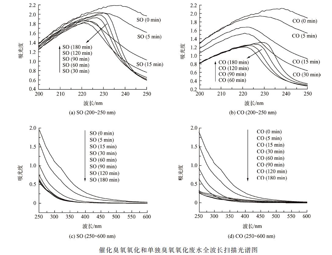 全波長掃描可以反映溶液整體對某一波長光的吸收性,適合分析含多種有機物的實際廢水。其中,紫外譜圖提供的是常見官能團信息。若溶液在220 ~ 250 nm 波段有強烈吸收,說明該溶液化合物中存在共軛雙鍵(共軛二烯烴、不飽和醛、不飽和酮),否則可能是飽和脂肪烴、脂環烴或其衍生物;化合物在250 ~290 nm 波段有強烈吸收,說明化合物分子中有苯環存在(以UV254 為代表);化合物在300 nm 以上有強烈吸收,說明分子中有較大的共軛體系(大分子腐殖質,以UV410 為代表)。廢水不調節pH 值(中性),臭氧投加量為10. 7 mg·min - 1 ,催化劑投加量為200 g·L - 1 。