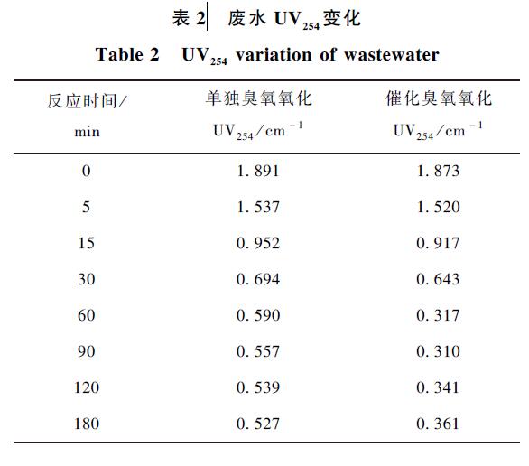 由表2 可知,單獨臭氧氧化對廢水UV254 的去除率為72. 1% ,催化臭氧氧化對廢水UV254 的去除率為80. 7% ,催化臭氧氧化的處理效果優于單獨臭氧氧化。