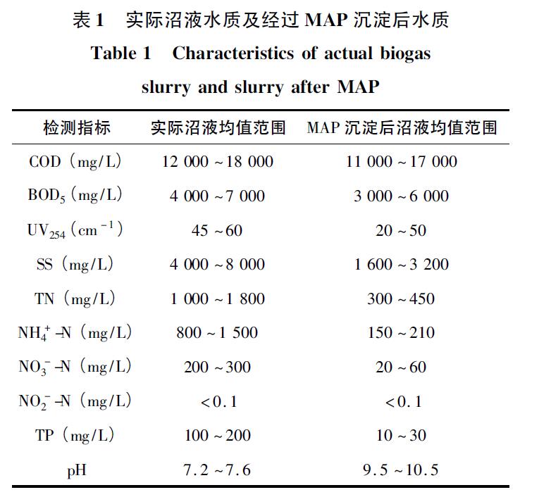 實驗所用厭氧沼液取自陜西省楊凌示范區某產業集團生豬實訓基地。該場生豬出欄量為18 萬頭/a,豬場廢水主要來自糞尿、豬舍沖洗水,豬場廢水由露天排水溝匯入厭氧沼氣池中,進行1 ~ 2 個月厭氧發酵。厭氧發酵后的沼液以MgCl2和Na2HPO4為沉淀劑,進行MAP 沉淀反應前處理。實際沼液水質及經過MAP 沉淀后水質情況如表1 所示。