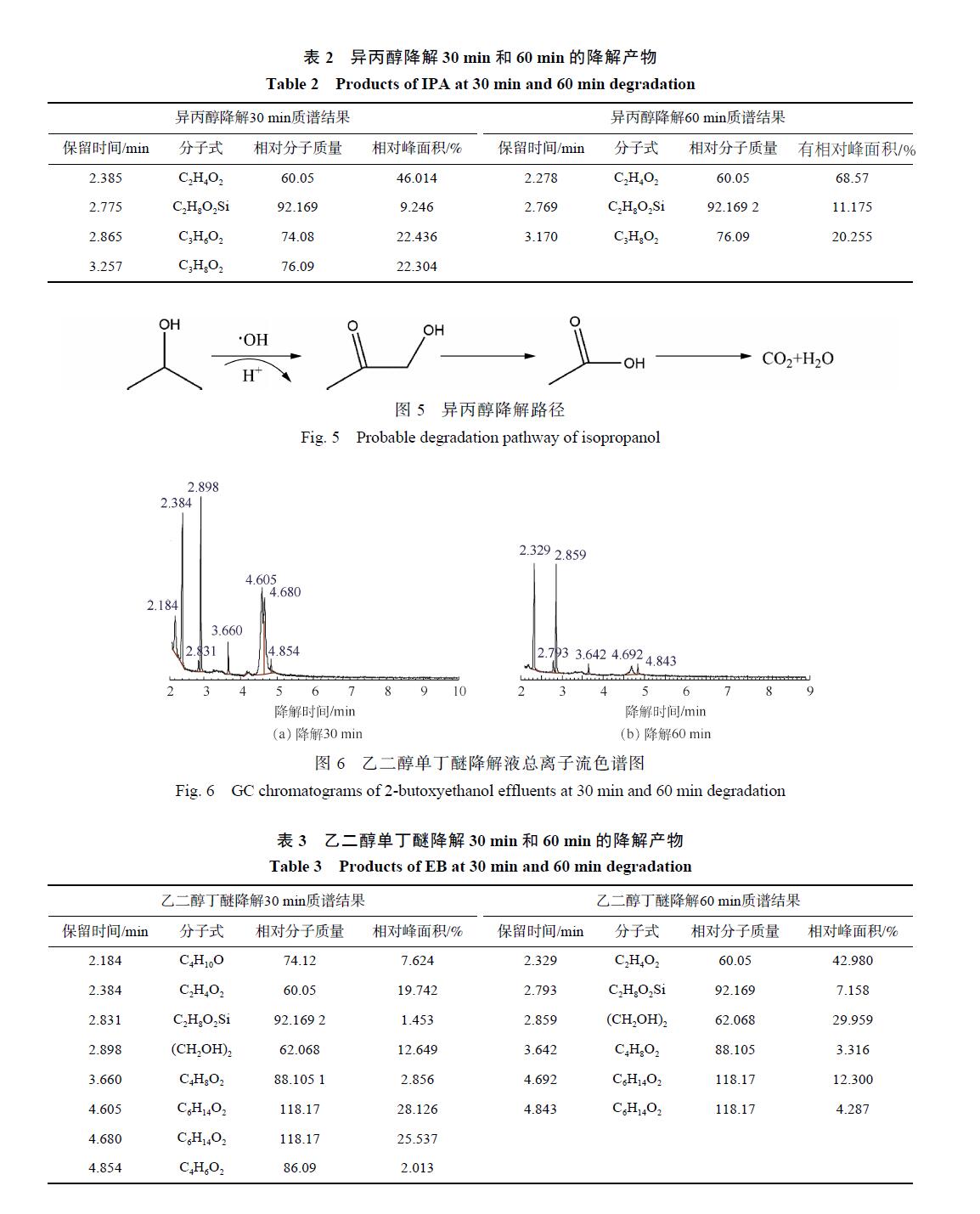 為了研究廢液的降解路徑,以廢液主要成分異丙醇和乙二醇單丁醚為例進行探討,對 2種物質進行降解并對降解產物用GC/MS進行檢測。