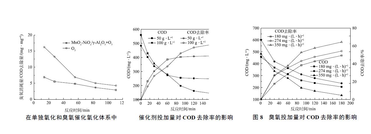 5) 連續進行4 h 的臭氧催化氧化實驗后發現,MnOx-NiOx/γ-Al2O3 穩定性和重復利用性較好,COD 去除率能維持在42% 左右不變,錳、鎳離子的溶出量均小于0.5 mg·L−1。