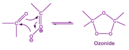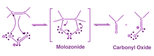 步驟1:  臭氧向碳-碳鍵的親電子加成形成了非常不穩定的莫洛宗尼德中間體。 由于這種不穩定的性質,莫洛宗尼德繼續反應-分解形成羰基分子和羰基氧化物分子,如下所示: