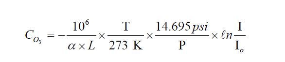 下面所示的Beer-Lambert方程,根據(jù)光強度的比值計算臭氧的濃度。