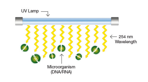 殺菌紫外線系統(也稱為紫外線消毒器)將水通過腔室并將其暴露在光線下,從而殺死微生物并使用光能分解氯胺。為了消毒水,必須使用特定的紫外線 - 254 nm具有 很大的殺菌作用。殺菌光改變或破壞微生物的DNA或RNA,例如藻類,細菌,病毒,霉菌孢子和原生動物。當微生物通過UV室時,這基本上會破壞微生物。紫外燈在由電力供電的腔室中產生紫外線。它有效地滅活有害微生物,包括隱孢子蟲(Cryptosporidium parvum)。該工藝不會產生有害副產物,并且能夠將氯消耗量減少25-50%。