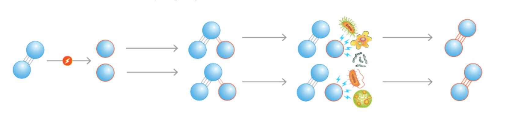 臭氧發生器使用光能或電能以及來自周圍空氣的氧氣。當添加這種能量時,常規氧分子(O 2)分裂成兩個單獨的原子(O 1)。然后O 1原子與其他氧分子(O 2)結合,產生O 3。光能與電能產生的臭氧之間的區別是數量 - 發電產生更高的臭氧輸出。當溶解在水中時,臭氧會殺死病原體和微生物,破壞有機物和無機物,并且還會通過氧化分解氯胺。